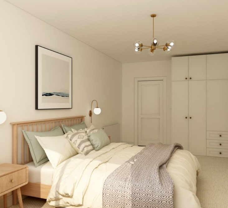 For the bedroom, my aim was to cultivate a tranquil and peaceful atmosphere. Considering the room's long and narrow layout, I sought to amplify the feeling of openness while optimizing storage options. I introduced a spacious IKEA Platsa modular wardrobe positioned discreetly behind the door and placed a wide chest of drawers beneath the window. Beside the drawers, a stool serves a dual purpose: it provides a comfortable seat for putting on shoes and offers extra storage.